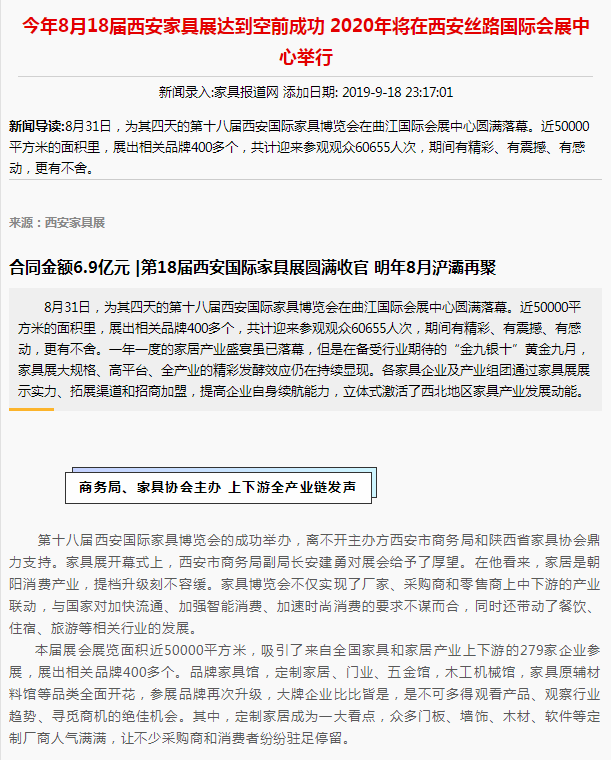 每年展會(huì)期間,相關(guān)媒體也會(huì)對(duì)展會(huì)盛況進(jìn)行全方位、高覆蓋式的宣傳報(bào)道?!吨袊?guó)家具報(bào)道》、《中國(guó)經(jīng)貿(mào)·家具中國(guó)》、《家居世界》、《華東家具》、《家居人物》、《家具酷》、香河家具城、家具迷、家具專(zhuān)區(qū)網(wǎng)、中國(guó)旅游報(bào)、中國(guó)信息報(bào)、陜西日?qǐng)?bào)、西安晚報(bào)、華商報(bào)以及陜西各電視臺(tái)等,都可見(jiàn)西安家具展的身影,其熱度可見(jiàn)一斑。