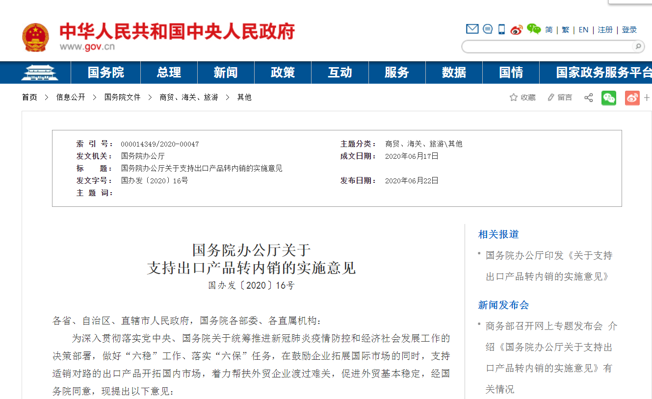 6月22日,國(guó)務(wù)院辦公廳發(fā)布了關(guān)于支持出口產(chǎn)品轉(zhuǎn)內(nèi)銷的實(shí)施意見,旨在鼓勵(lì)企業(yè)拓展國(guó)際市場(chǎng)的同時(shí),支持適銷對(duì)路的出口產(chǎn)品開拓國(guó)內(nèi)市場(chǎng),著力幫扶外貿(mào)企業(yè)渡過(guò)難關(guān),促進(jìn)外貿(mào)基本穩(wěn)定。